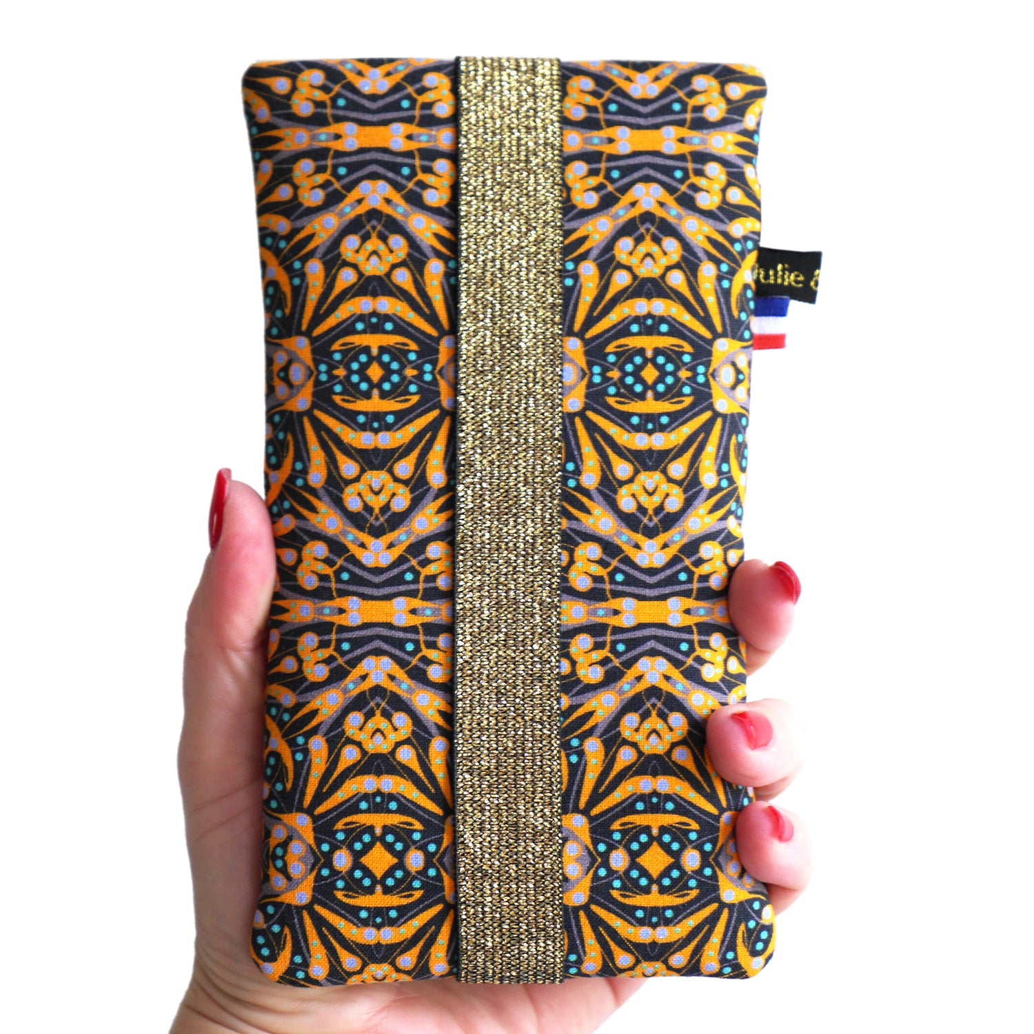 Housse universelle téléphone portable tissu motifs ethnique graphique jaune bleu noir fermeture élastique taille au choix