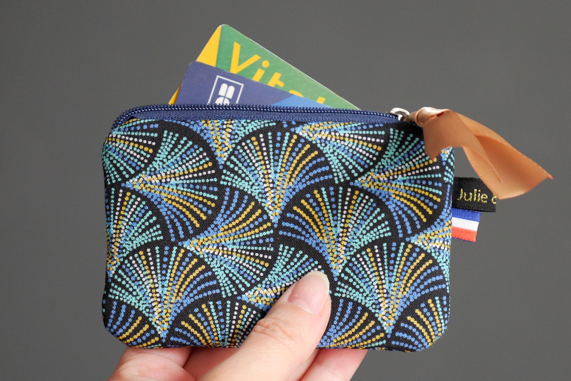 Mini porte-monnaie en tissu motifs graphiques écailles plumes pointillés bleu turquoise et marine