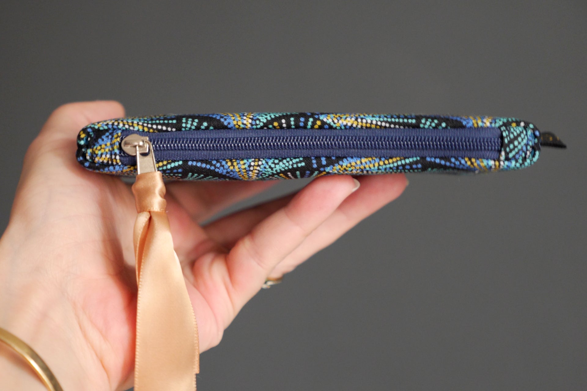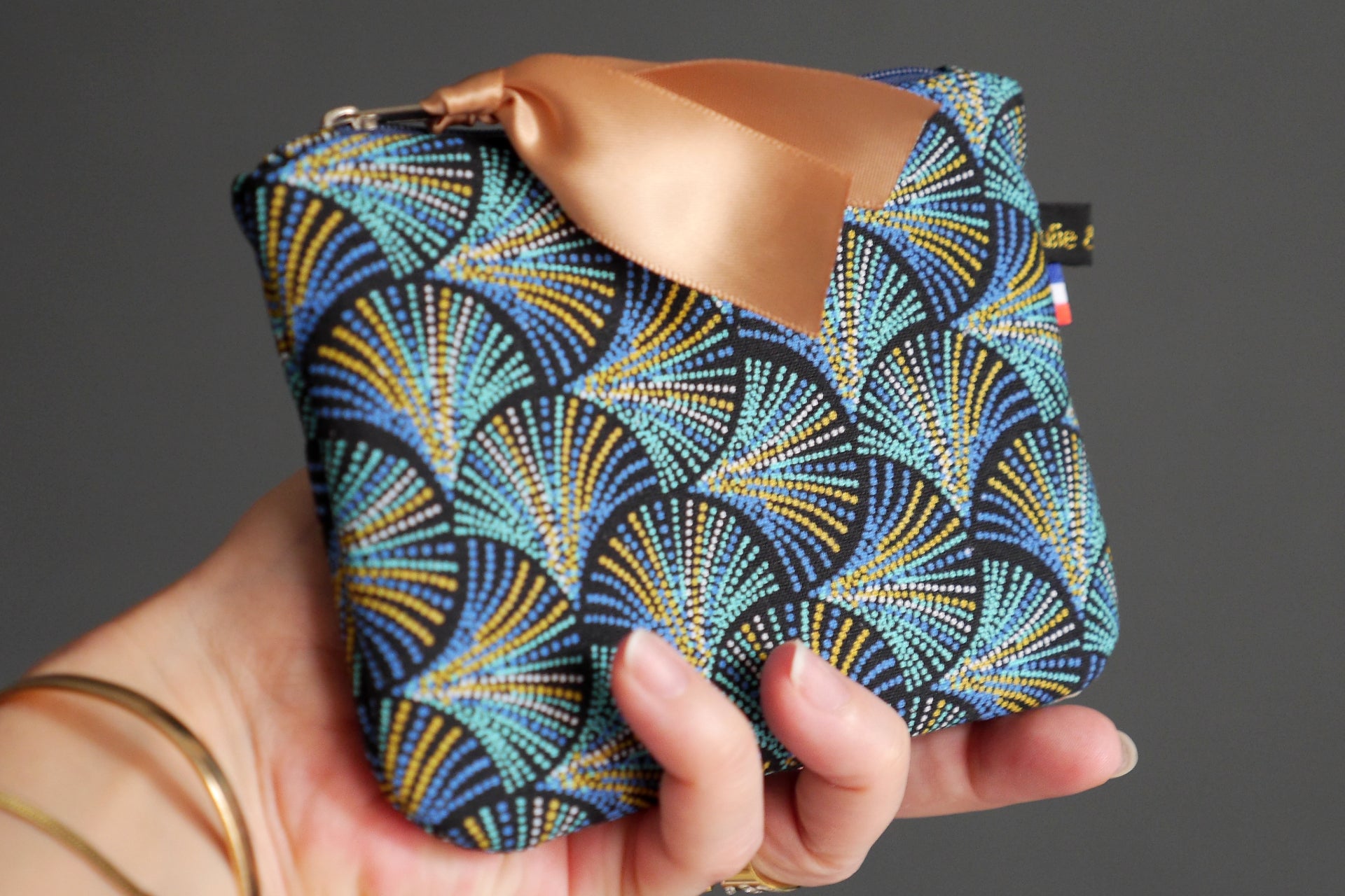 L’extérieur du porte-monnaie est réalisé dans un coton renforcé aux motifs modernes et vibrants d’écailles plumes qui rappelle l’esthétique des motifs wax aux couleurs bleu marine, bleu turquoise, noir. L’intérieur est en coton motifs écailles japonisants sur fond bleu pétrole.