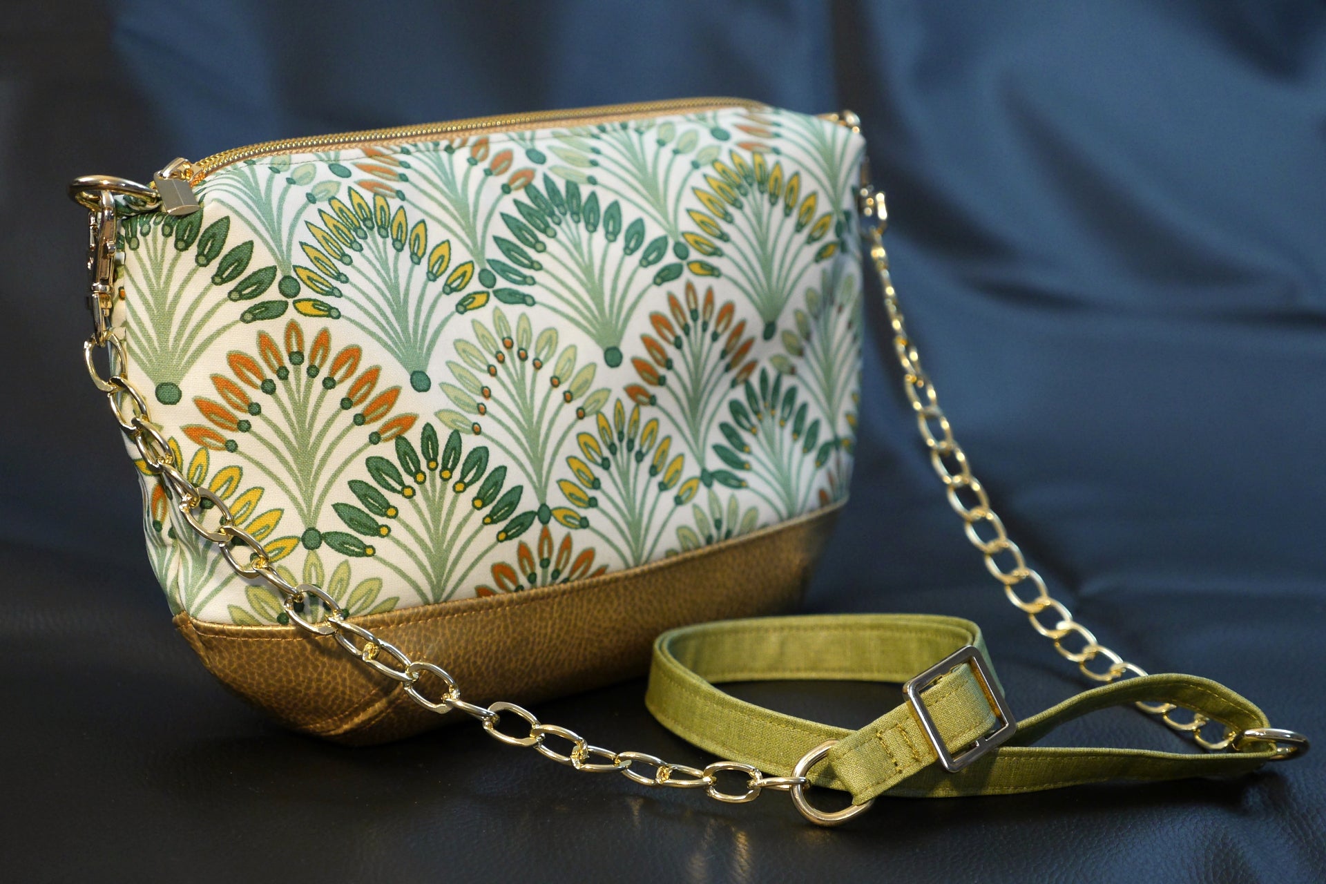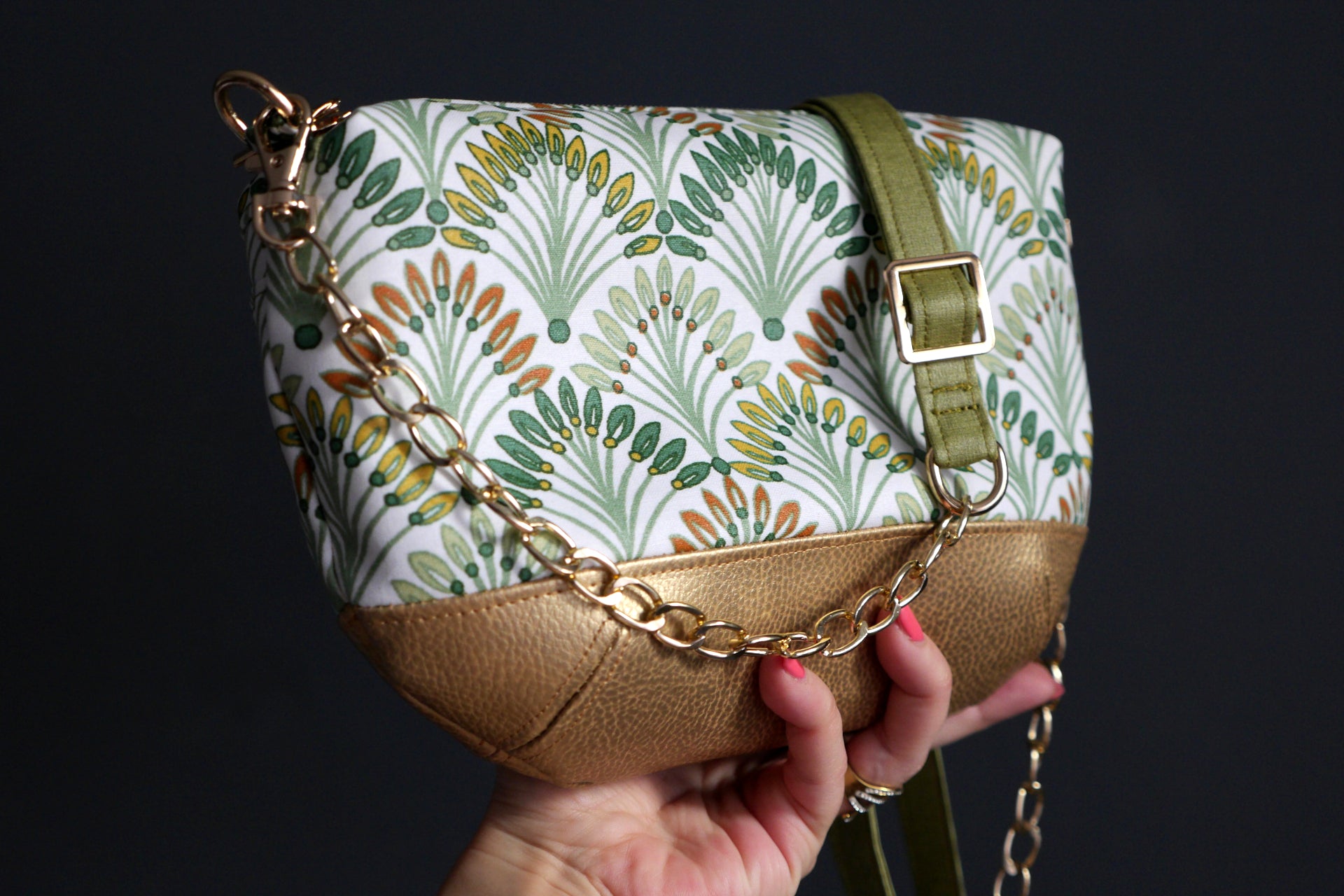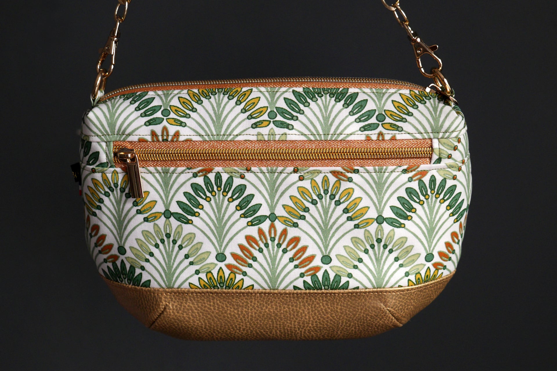 Sac à main tissu enduit imperméable palmiers et simili cuir doré avec bandoulière réglable