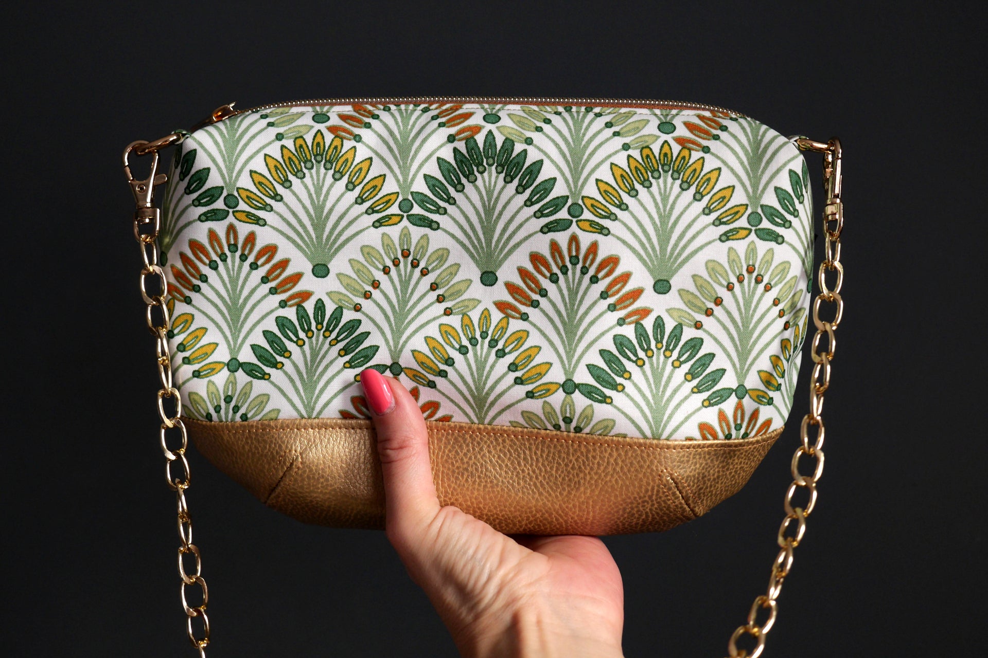 Sac à main entièrement réalisé à la main dans un tissu coton enduit imperméable renforcé aux motifs de palmiers graphiques dans les tons vert, orange et jaune sur fond blanc. L’intérieur est en tissu coton enduit imperméable vert brillant. Le bas du sac est en simili cuir doré.